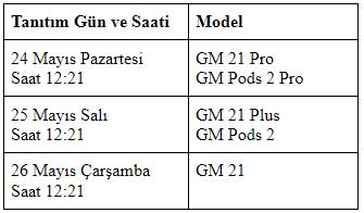 General Mobile, resmi sosyal medya hesapları ve web sitesi üzerinden 24 Mayıs Pazartesi günü saat 12:21’de başlamak üzere GM 21 Pro ve GM Pods 2 Pro, 25 Mayıs Salı günü saat 12:21’de GM 21 Plus ve GM Pods 2, son olarak da 26 Mayıs Çarşamba günü saat 12:21’de GM 21 ürünlerini tanıtarak tüketicilerin beğenisine sunacak ve ön siparişe açacak.