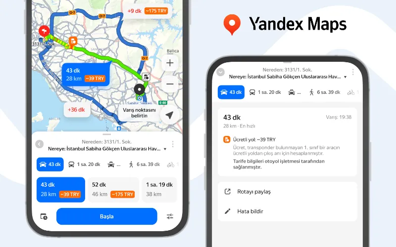 Örneğin İstanbul’un Avrupa Yakası’ndan Sabiha Gökçen Havalimanı’na yapılacak bir yolculukta, önerilen rotada Yavuz Sultan Selim Köprüsü ve Kuzey Marmara Otoyolu (O-7) gibi ücretli yollar yer alabiliyor. Yandex Maps, bu rotada karşılaşılacak tüm geçiş ücretlerini kullanıcıya açık biçimde sunuyor. Bu özellik, hem iOS hem de Android işletim sistemlerinde Yandex Maps ve Yandex Navi uygulamalarının en güncel sürümlerinde kullanılabiliyor.
