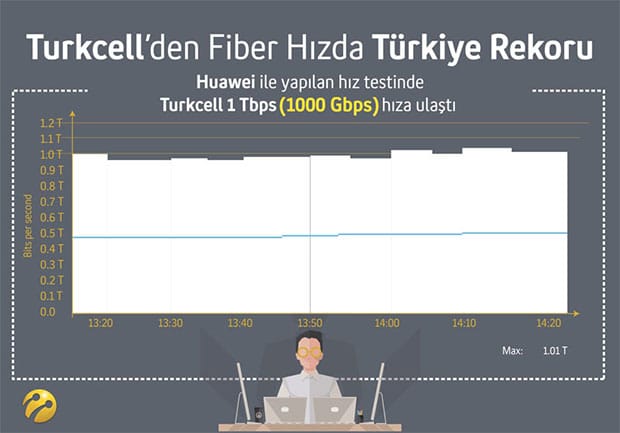 Turkcell Maltepe Plaza’da laboratuvar ortamında gerçekleştirilen hız testiyle Türkiye’de ilk defa fiber altyapı üzerinde, OTN tabanlı DWDM (Dense Wavelength Division Multiplexing/Yoğun Dalga Boyu Bölmeli Çoklama) teknolojisi kullanılarak ‘tek kanal kartı’ ve ‘tek süper kanal” üzerinde 1000 Gbps’lik (1Tbps) veri taşındı. Testte Huawei firması tarafından üretilen ve “Flex Grid” yapısını destekleyen OTN OptiX OSN 9800 ekipmanlar kullanıldı. Ekipmanların “Flex Grid” yapısı sayesinde klasik DWDM sistemlerinde 50 Ghz olarak kullanılan kanallar arası boşluk daraltılarak fiber spektrum kullanım verimliliği %25 arttırılabiliyor.