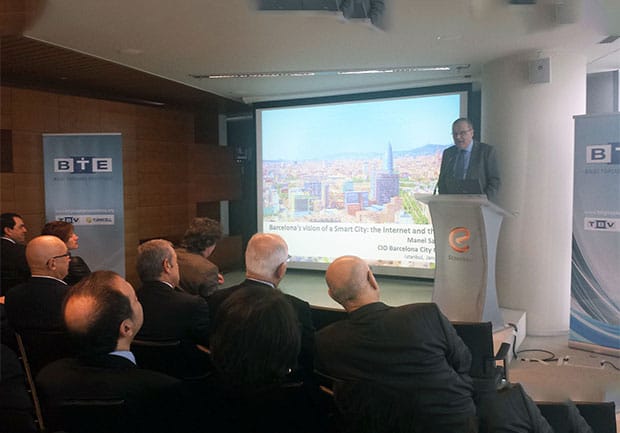 Türkiye Bilişim Vakfı ile Turkcell işbirliğiyle kurulan Bilgi Toplumu Enstitüsü, 19 Ocak’ta İstanbul’da Akıllı Şehirler panelini düzenledi. İnovasyon ve teknoloji odaklı uygulamalarıyla Barselona’nın akıllı şehre dönüşmesinde kritik rol üstlenen Barselona Şehir Konseyi CIO’su Manuel Sanroma’nın konuşmacı olduğu etkinlikte, Barselona’nın akıllı şehir olma süreci masaya yatırılırken, İstanbul’un akıllı şehre dönüşmesi için neler yapılabileceği tartışıldı.