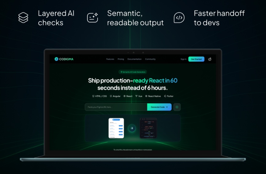 Codigma.io, Figma gibi popüler tasarım araçlarında oluşturulan kullanıcı arayüzlerini React, Angular, Vue, Flutter veya HTML/CSS ortamlarına aktarılabilir hâle getiriyor. Bu özelliğiyle, dünya genelinde öne çıkan Lovable gibi tasarımdan koda dönüşüm platformlarıyla aynı kategoride yer alıyor ve Türkiye’den çıkan yerli bir alternatif sunuyor.