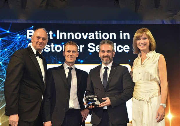 Fotoğraftakiler: Steve Redgrave (törenin sunucusu), Stuart Dorman “Best innovation in customer service” kategorisinin ödül sponsoru SABIO şirketi yetkilisi, Uğur Aydın Vestel Müşteri Hizmetleri İş Geliştirme Müdürü, Fiona Bruce (törenin sunucusu)